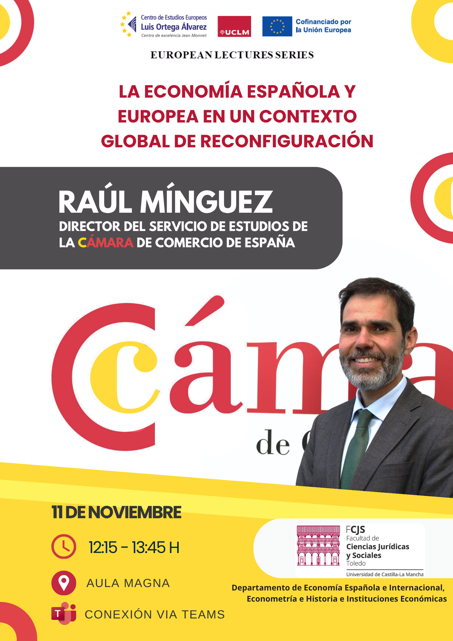 Se informa de la organización el próximo martes 11 de noviembre de 12h a 14h en el Aula Magna, de la conferencia "La Economía Española y Europea en un contexto global de reconfiguración" impartida por el Director del Servicio de Estudios de la Cámara de Comercio de España, Raúl Mínguez.