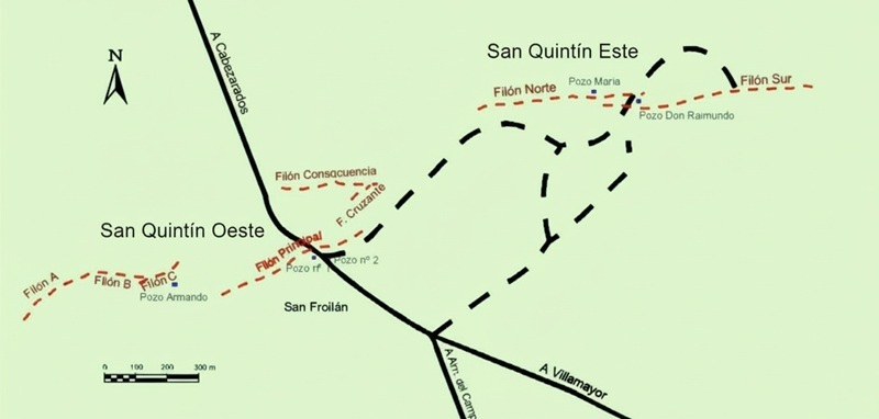 Distribución de los filones explotados en las áreas de San Quintín Oeste y San Quintín Este.