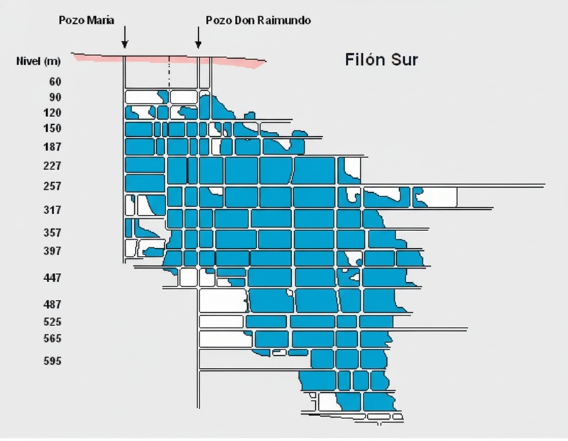 Esquema de las labores sobre el filón Sur, explotado mediante los pozos María y Don Raimundo.